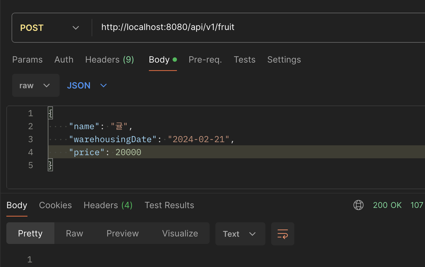 (1) Postman을 실행하여 요구사항에 맞게 과일 이름은 사과, warehousing_date는 2024-02-21, 가격은 10,000원으로 설정하고 요청을 보내게 되면 200 OK를 응답받은 것을 확인했다.