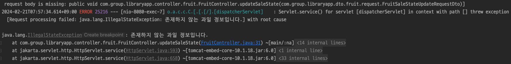 (2) 그러나 입고되지 않은 과일 대상으로는 판매 상태를 바꾼다는 것 자체가 모순이므로 위와 같이 selectSql을 처음에 먼저 실행시키고 만약 요청 바디에 넘어온 아이디 값을 기준으로 입고된 과일이 아니라면 IllegalStateException 예외를 발생시켜서 과일의 상태를 업데이트할 수 없도록 설계한다.