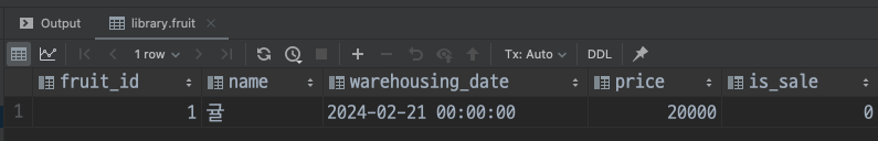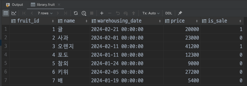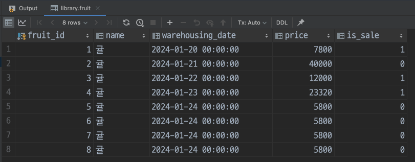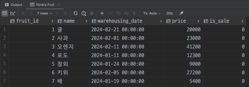 (2) 판매 여부를 설정해 주기 위해 is_sale 컬럼을 넣었으며 입고된 과일은 판매되지 않았으니 기본값은 0으로 간주하자.