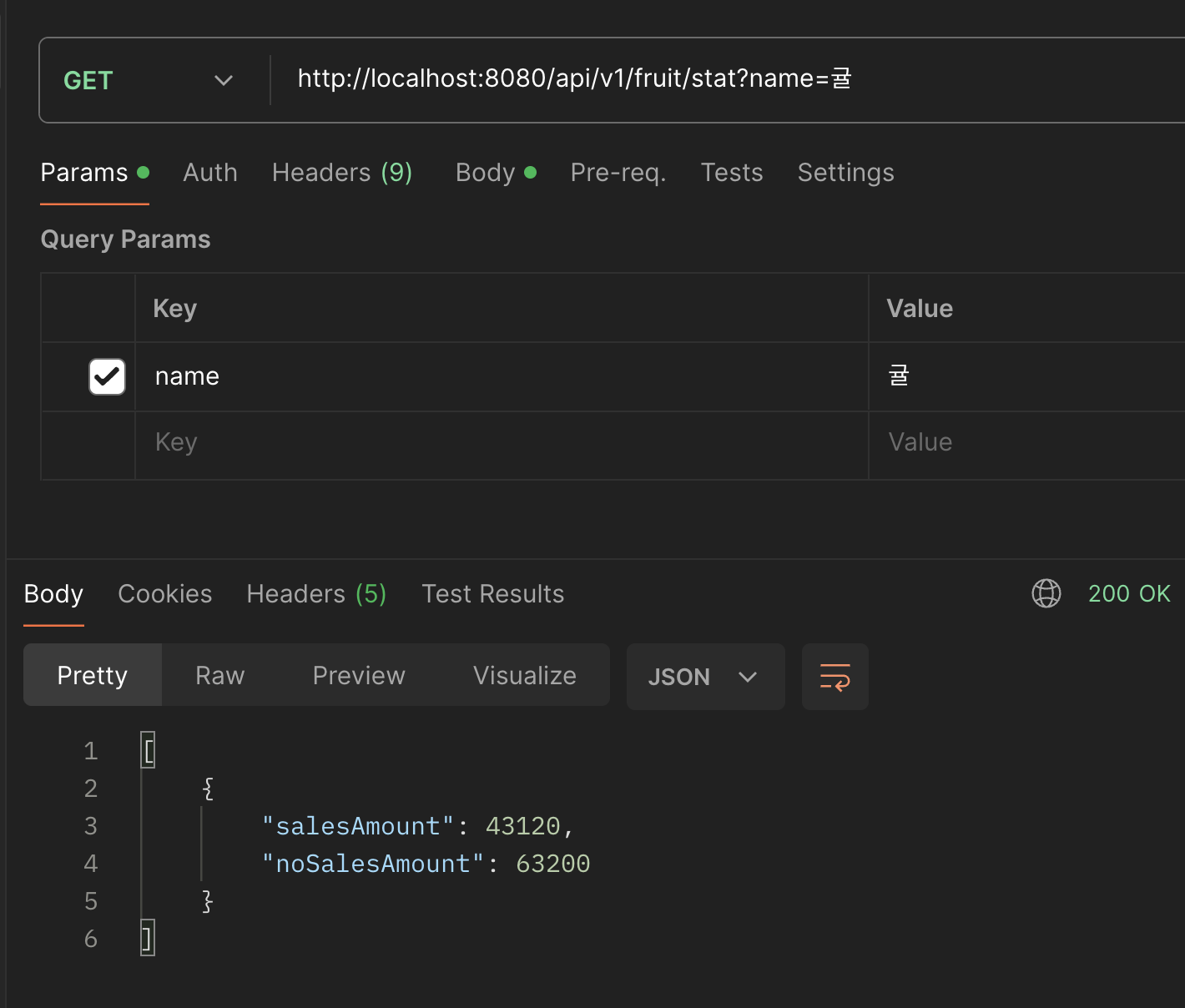 (2) 이것보다 더 좋은 방법으로 풀으신 분도 있겠지만 우선 위에서 정의한 판매상태 0, 1을 기준으로 각각의 총합 금액을 계산하는 쿼리를 작성해서 rs 변수에서 각각의 결과를 받고 FruitSaleNoSaleTotalPriceDto 생성자를 만들어서 해당 값들을 API로 반환할 수 있도록 설계했다.
