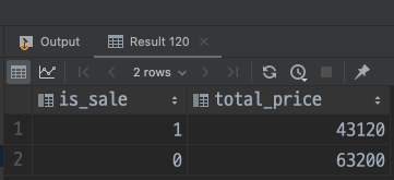 (2) 위의 귤 항목만 나열된 테이블들을 확인해 보면 판매 상태에 따라 판매 금액(is_sale = 1)의 총합 43,120 판매되지 않은(is_sale = 0) 총 금액 63,200이 정상 반환된 것을 확인할 수 있었다.