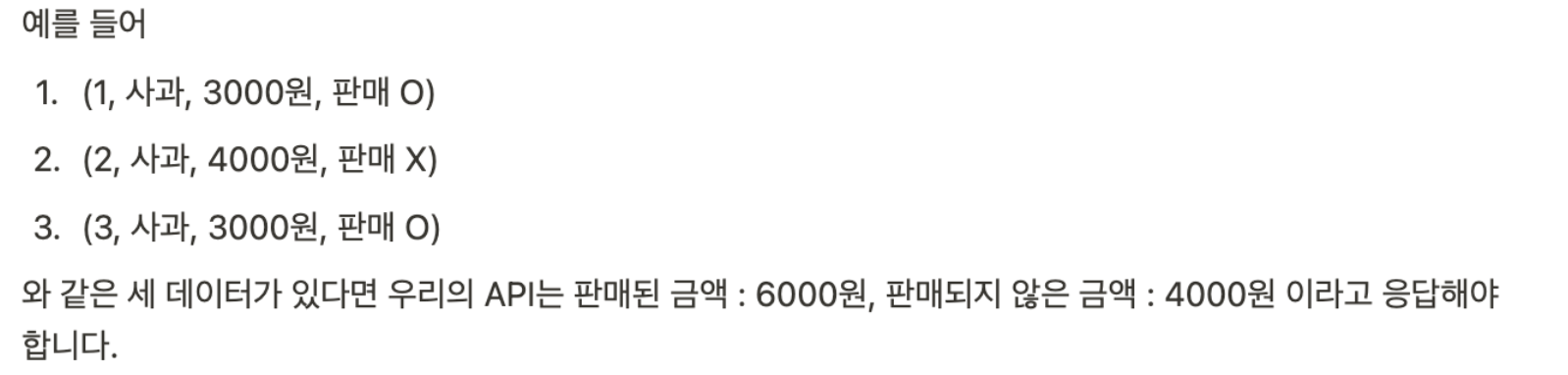 (1) 특정한 과일을 대상으로 판매된 금액, 판매되지 않은 금액의 총합을 계산해보는 API를 설계하자.
