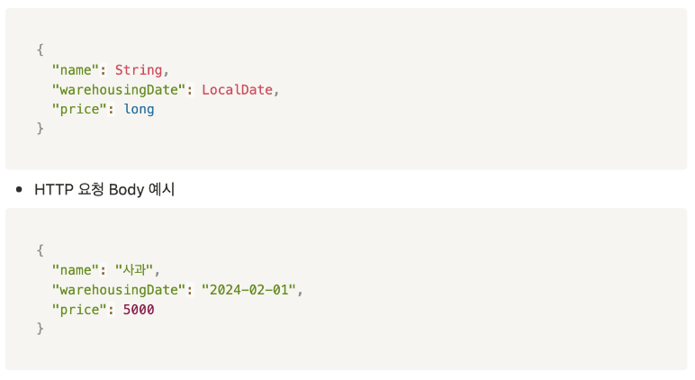 (1) POST 요청임에 따라 넘어온 요청 바디의 name, warehousingDate, price를 모두 받아와서 jdbcTemplate.update() 메서드를 통해 쿼리의 ?(와일드 카드) 부분에 모두 매핑시킨다.