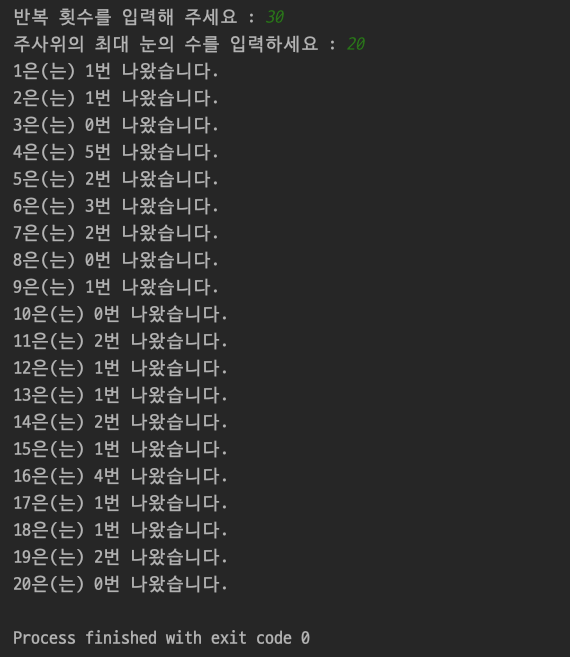 (1) 우선 반복 횟수와 주사위에서 나올 최대 눈의 수(수의 범위)를 직접 사용자한테 입력받도록 설정한다.