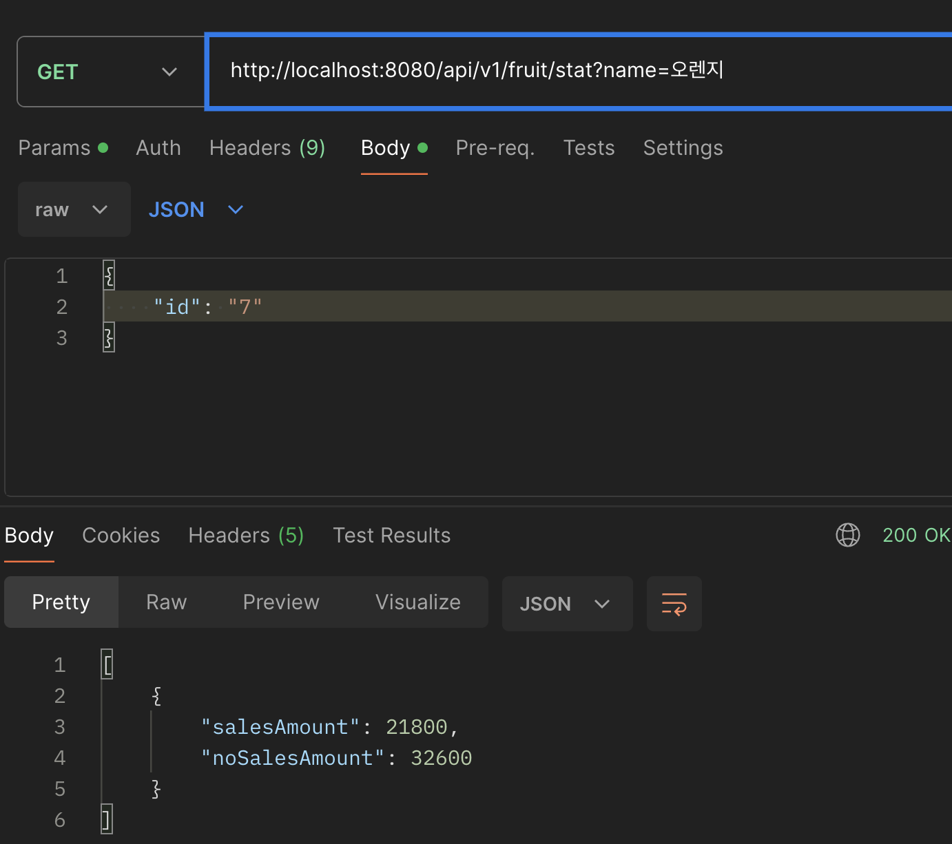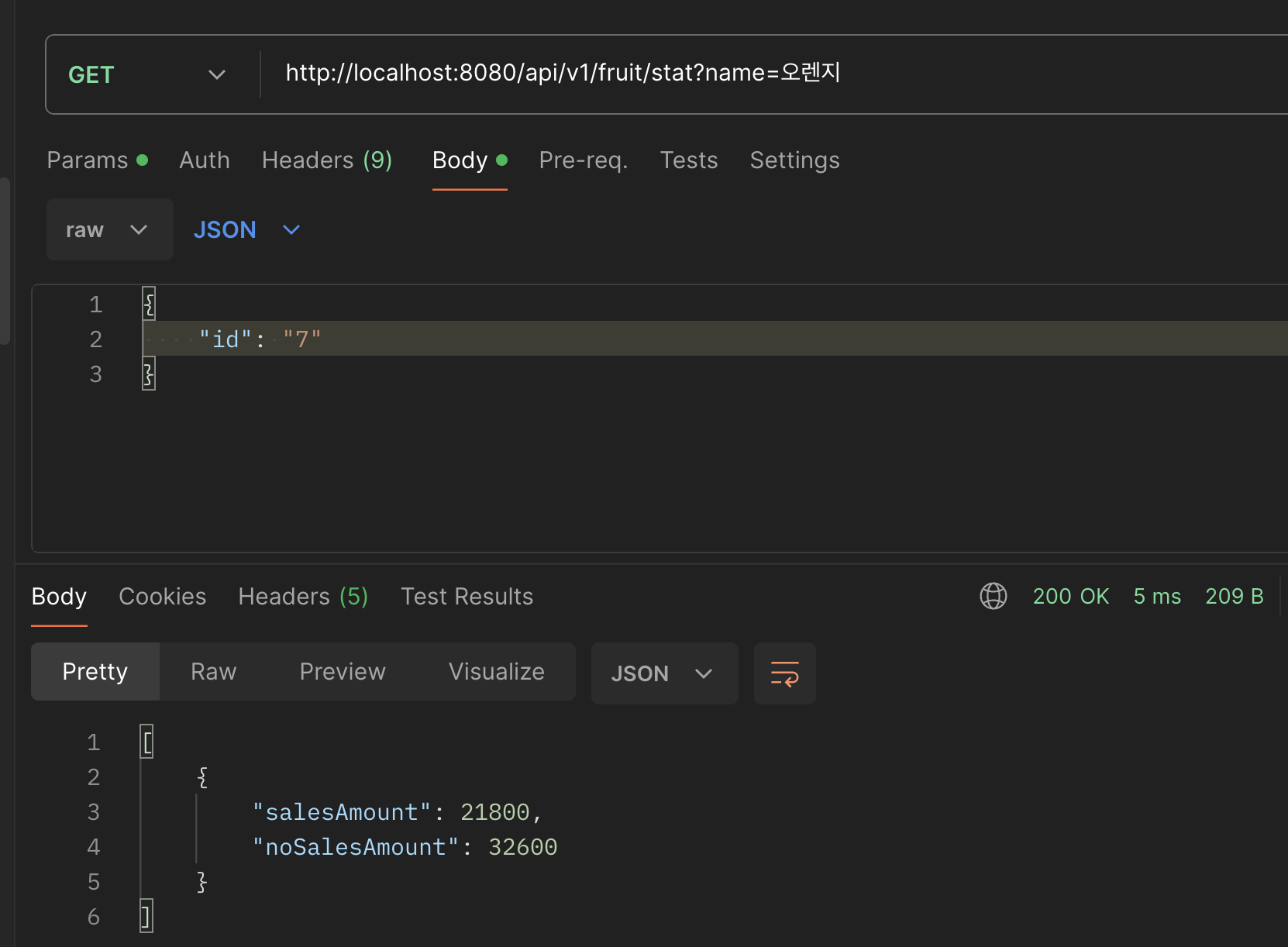 (3) 위와 같이 쿼리 파라미터로 과일 이름을 주어 조회 결과를 확인해 보면 각각의 금액이 정상적으로 반환된 것을 확인할 수 있다.