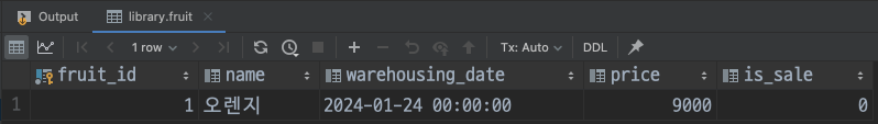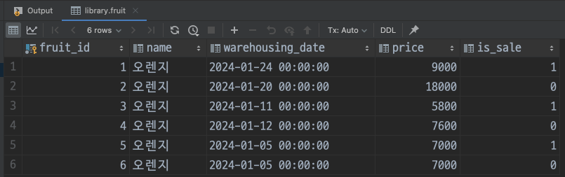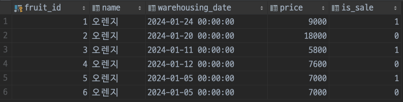 (1) 현재 데이터베이스 테이블을 확인해 보면 판매된 과일은 1, 3, 5번, 판매되지 않은 과일은 2, 4, 6번이다.