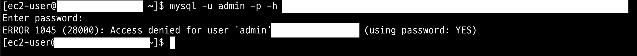 (2) RDS 생성 시 지정한 유저명, 비밀번호를 정확하게 입력했음에도 불구하고 지속적으로 위와 같은 접속 오류 "ERROR 1045 (28000): Access denied for user ~ (using password: YES)"를 확인할 수 있었다.
