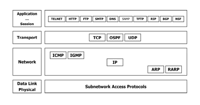 - 네트워크 측면(TCP/IP)에서는 크게 Network Access Layer(L1, L2), Network Layer(IP), Transport Layer, Application Layer 4계층으로 구분한다.
