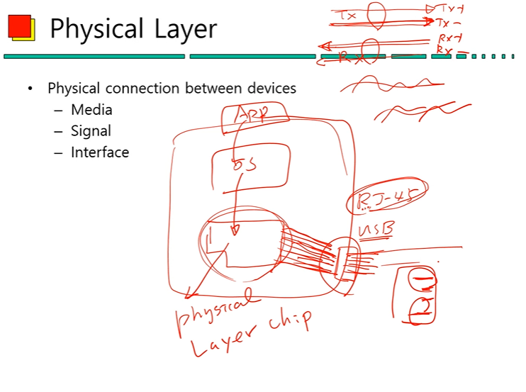 - 물리 계층에서의 특정 하드웨어 부분에서는 전기 신호를 주고받는다. (예시)