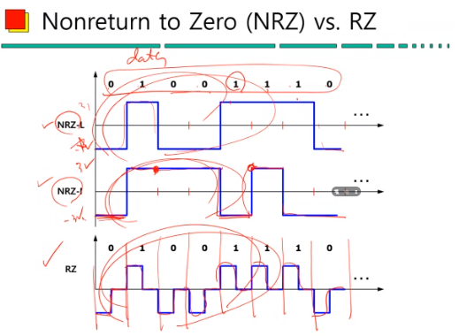 (2) 1계층 영역에서 아날로그 데이터를 디지털 데이터로 변경하는 과정이 발생한다.