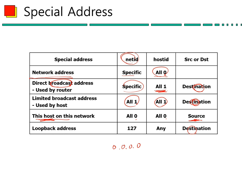 • Limited broadcast는 host에서 사용하고 모든 bit가 1이다.