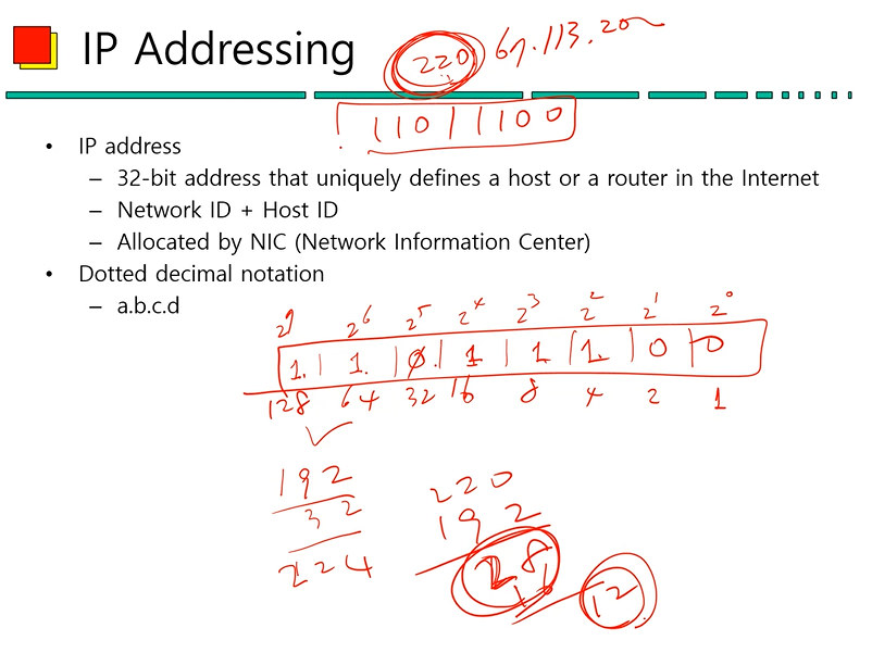 (1) IP 주소의 클래스를 구분할 수 있는데, 네트워크 아이디의 1바이트 부분이 어떻게 시작하는지를 확인해 보면 클래스 구분이 가능하다. 예를 들어 220.67.113.200의 경우 110으로 시작하기 때문에 C 클래스다.