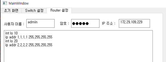 self.tabWidget.setTabText(self.tabWidget.indexOf(self.tab_3), _translate("MainWindow", "Router 설정"))
