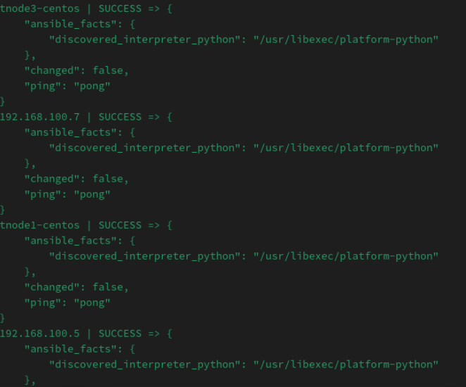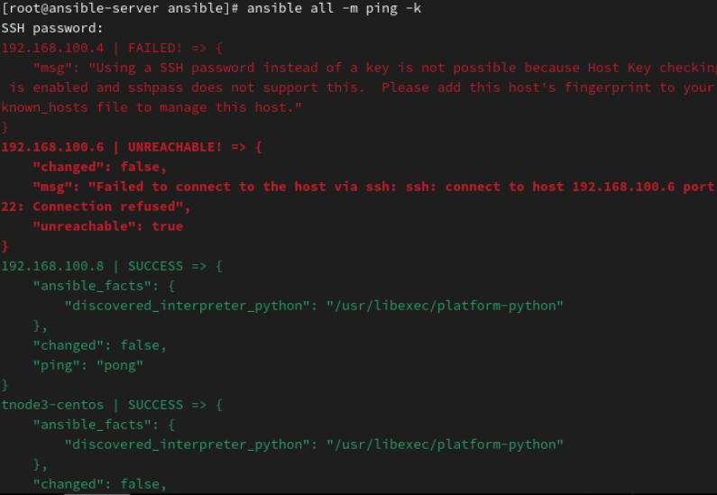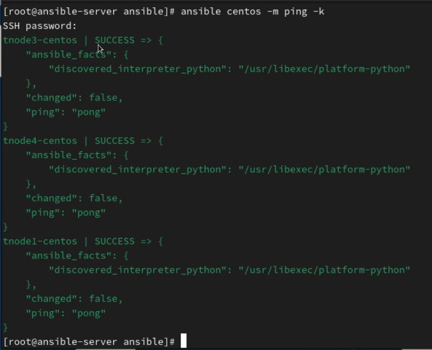 - ansible all -m ping -k 명령어는 Ansible의 ping 모듈을 사용하여 모든 호스트에 대해 연결을 테스트하는 데 사용