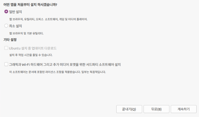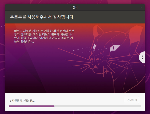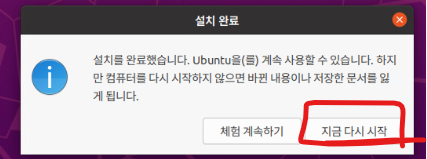 (1) Ubuntu 설치를 마치고 재시작을 진행한 뒤 나머지 기타 설정까지 마무리되면 설치 과정이 완료된다.