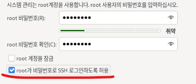 (4) 루트는 시스템 관리자, 시스템 전체 설정에 관여할 수 있는 역할이며 잠글 경우 루트 계정이 막히게 된다. 또한 SSH 원격 접속을 허용할지도 물어보는데 아래만 체크 후 진행한다.