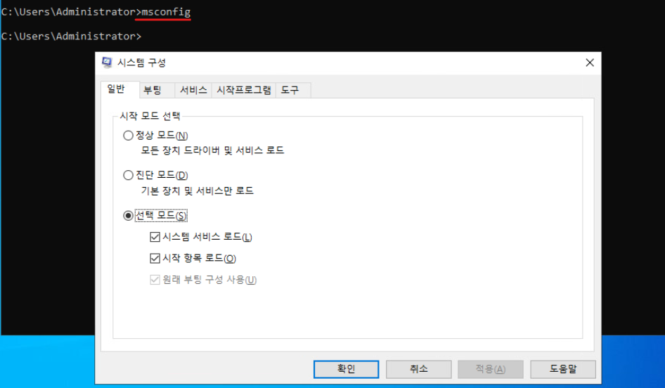 (1) Command Prompt에서 msconfig 커맨드 실행한다.