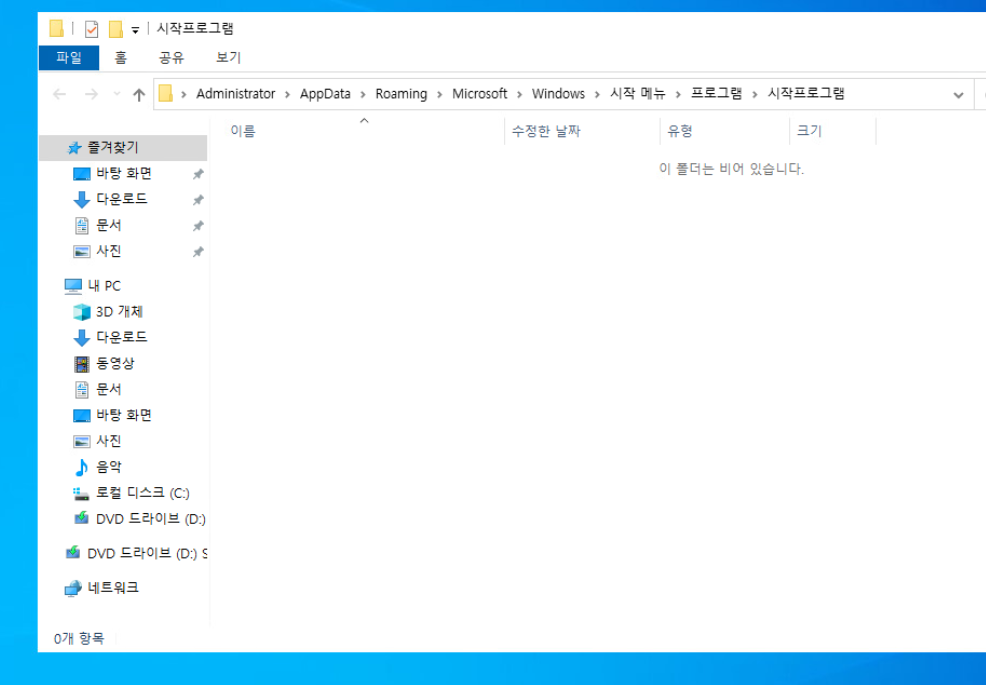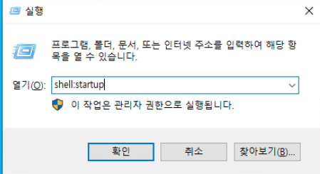 (7) 표준 옵션으로 재부팅한 후 윈도우의 시작 메뉴에서 실행 → shell:startup를 통해서도 C:\Users\Administrator\AppData\Roaming\Microsoft\Winows\Start Menu\Programs\Startup 디렉터리에 접근 가능하다.