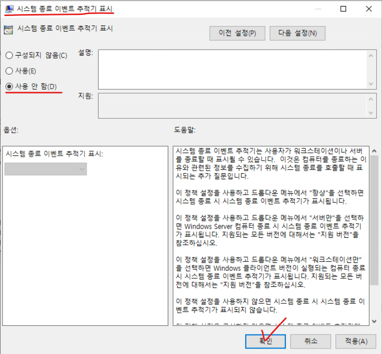 (1) 윈도우 서버는 종료 및 재부팅 시 사유를 선택해야 한다.