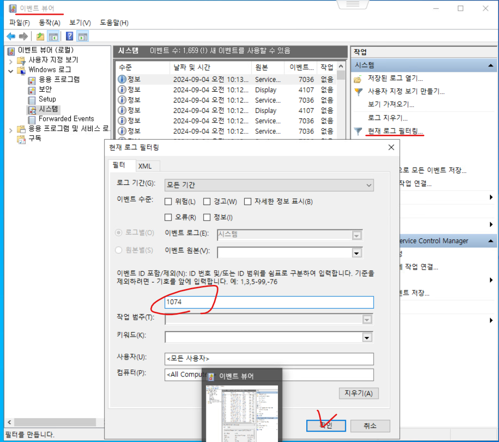 - 이벤트 뷰어 접속 → 현재 로그 필터링 → 로그 필터링을 위한 이벤트 번호 입력 후 확인