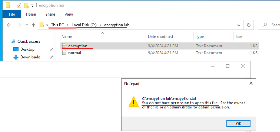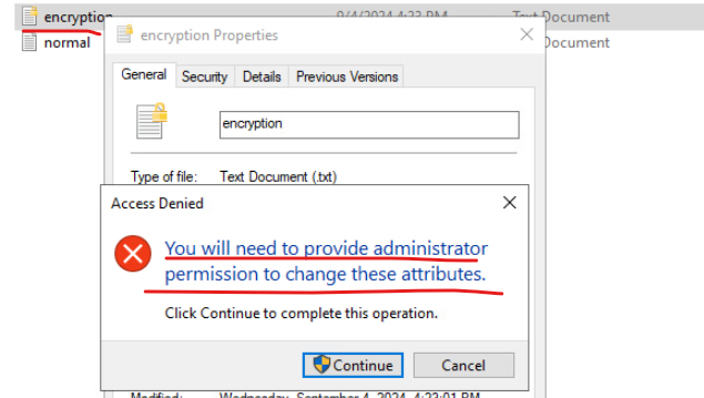 (9) 또한, 암호화된 파일의 Advanced 설정에서 암호화 옵션을 해제하려고 하면 USER2는 USER1이 소유한 파일의 속성 변경 권한이 없기 때문에 암호화 해제 작업이 Deny 된다.