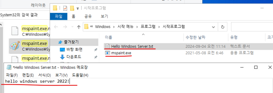 (7) 이후 시스템을 재부팅하면 Hello Windows Server.txt, mspaint.exe가 실행된다.