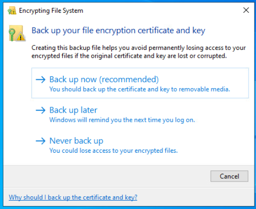 (1) USER1로 재접속하고 작업 표시줄을 확인해 보면 위와 같은 인증 키를 백업하라는 메시지가 노출된다.