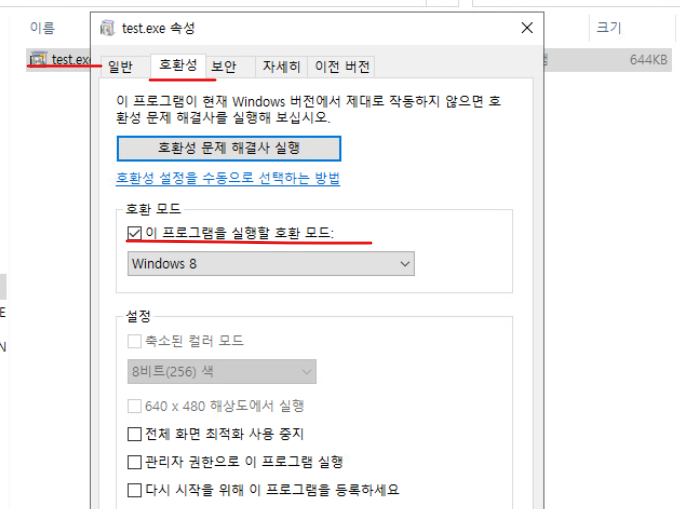 (10) 생성된 파일의 Properties의 호환성 탭에서 해당 파일이 실행될 호환 모드를 수정해 줄 수도 있다.