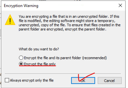 (5) 설정을 완료하는 시점에서 위와 같은 경고 메시지가 확인되는데 Encrypt the file only를 체크하고 OK를 누른다.