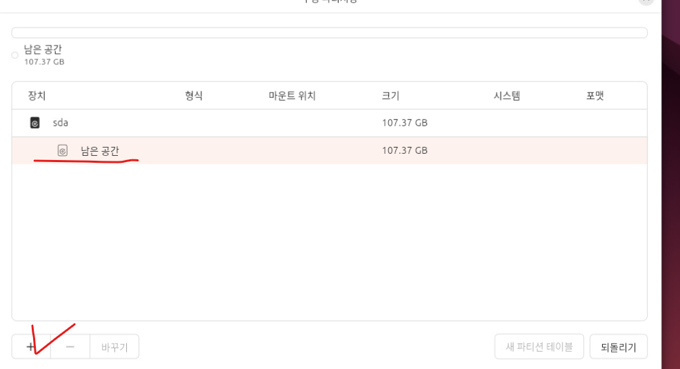 (3) 남은 공간을 선택하고 하단 +을 클릭한다.