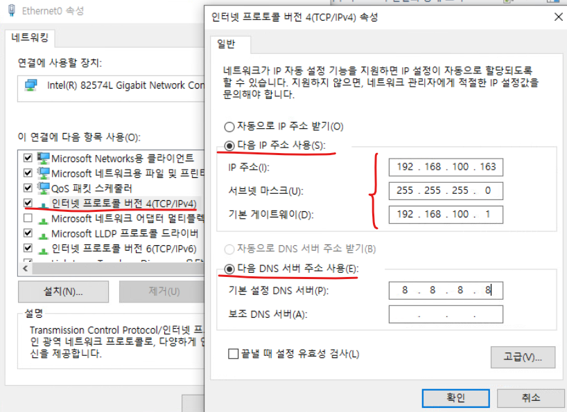 (2) 네트워크 인터페이스 / 이더넷 설정 부분에서 주소를 수동으로 할당해 준다.