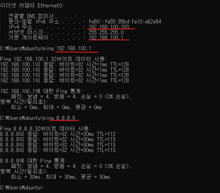(4) 게이트웨이, DNS 서버 주소로도 ping이 수행되는지 확인한다.
