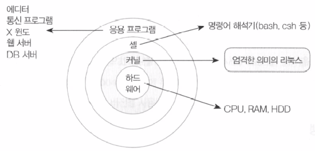 (2) 리누스 토르발스가 커널 부분을 작성해서 배포했고, 이후 이 커널에 컴파일러, 쉘, 기타 응용 프로그램들이 조합된 배포판이 바로 사람들이 알고 있는 일반적인 리눅스다.