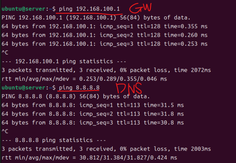 (2) 마찬가지로 게이트웨이, DNS 서버로 ping이 수행되는지 체크한다.