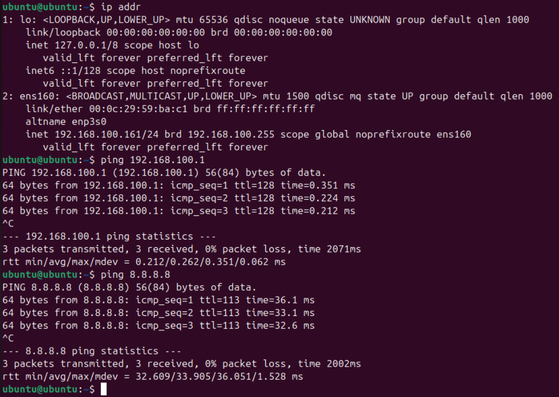 (1) 위와 같이 가상 머신 설정 / Ubuntu 설치 작업을 진행해 주고 네트워크 ping 수행 및 인터넷 연결이 정상적으로 되는지 확인한다.