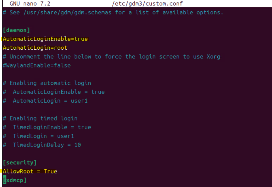 (2) nano /etc/gdm3/custom.conf 수정