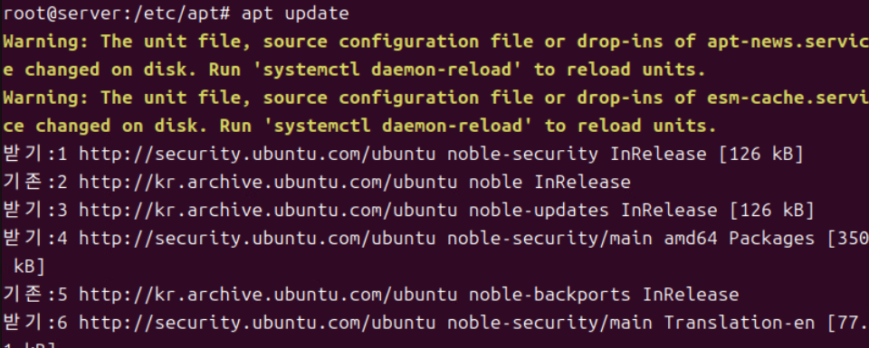 (2) apt update로 설정한 내용을 반영한다.