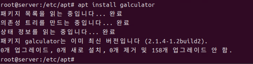 (5) 이미 최신 버전이 설치되어 있기 때문에 apt install gcalulator 커맨드가 수행되지만 설치는 되지 않는다.