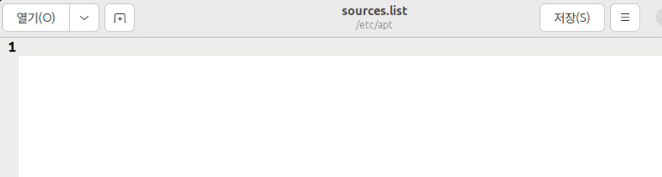 (1) gedit /etc/apt/sources.list 커맨드로 geditor를 열면 우선 내용이 공백인 것을 확인할 수 있다.