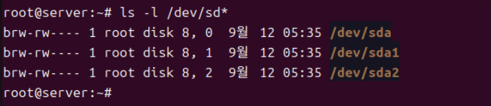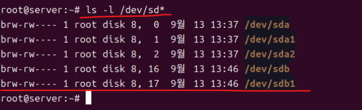 (4) 위와 같이 파티션을 생성한 후 ls -l /dev/sd*으로 생성된 파티션을 확인한다.