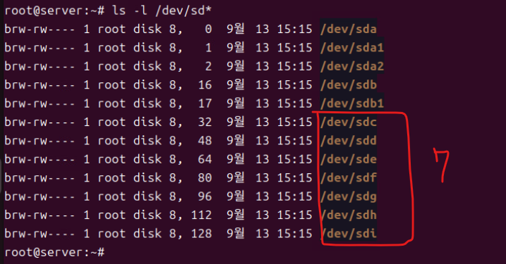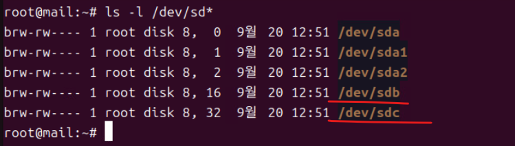 (2) 하드 디스크를 추가하고 재부팅한 뒤 ls -l /dev/sd*로 추가된 물리 디스크 확인한다.