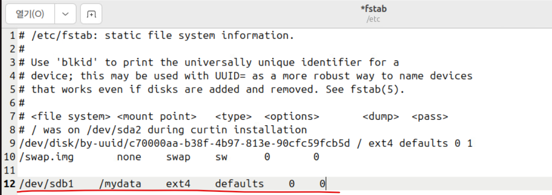 (6) 재부팅 이후에도 마운팅 환경을 영구적으로 유지하기 위해 nano 또는 geditor를 통해 /etc/fstab 디렉터리를 열어서 아래와 같은 구문을 추가한다.