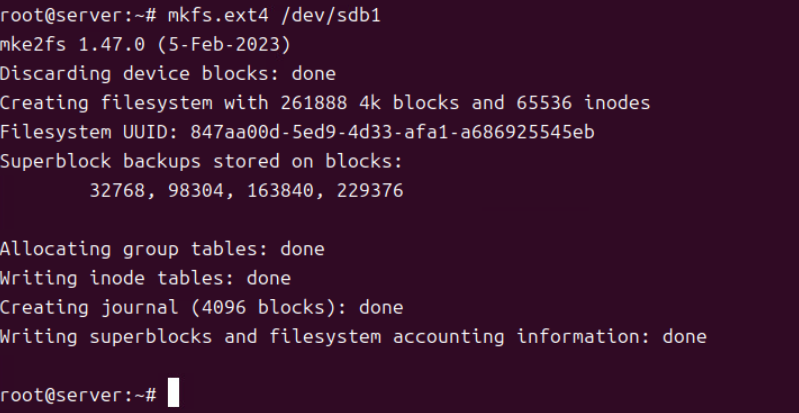(3) mkfs.ext4 /dev/md1 또는 mkfs -t ext4 /dev/md1 커맨드를 통해 /dev/md1 파티션 장치를 포맷한다.