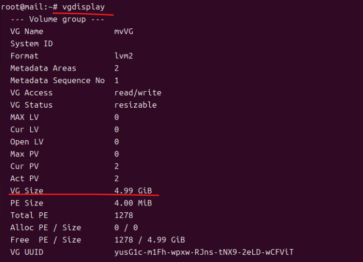 (8) vgdisplay를 통해 format = lv2 vg name = myVG, free PE Size = 4.99gb 인 부분을 확인한다.