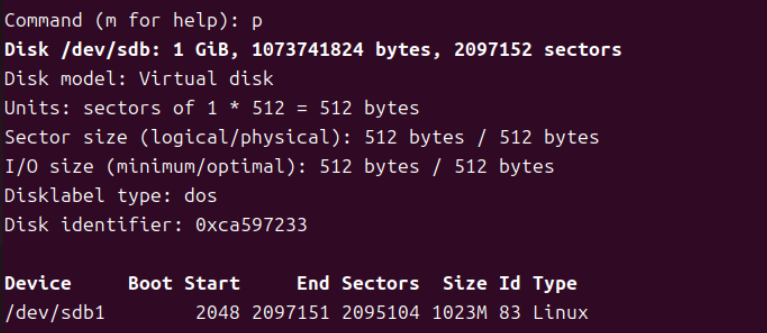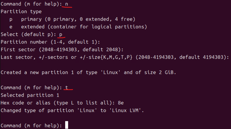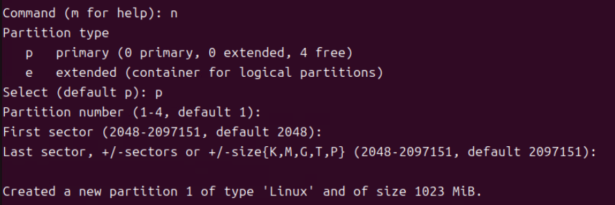 (5) n 커맨드로 파티션 타입을 p로 주고 First, Last sector 값을 모두 기본값으로 준다. (Sector 값의 경우 Enter 개행을 주면 자동으로 기본값이 지정된다.)