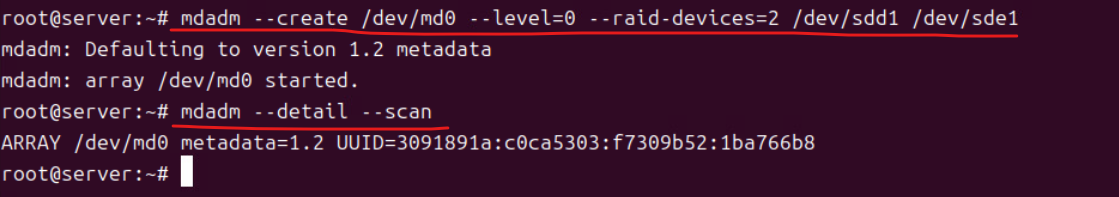 (12) mdadm --create /dev/md0 --level=0 --raid-devices=2 /dev/sdd1 /dev/sde1
