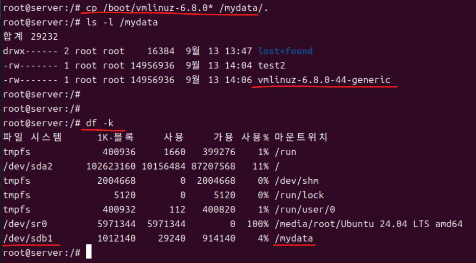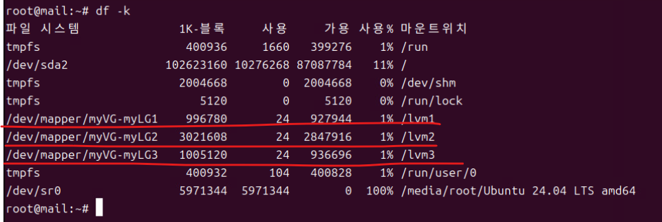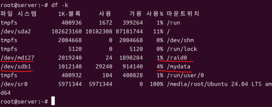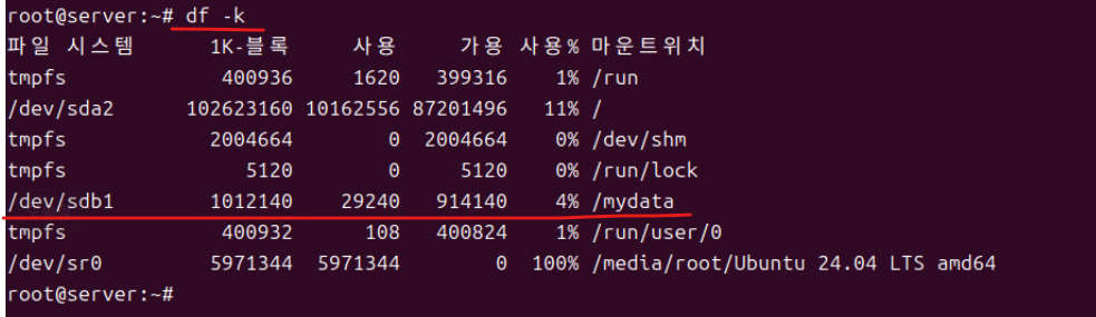 (5) 이후 df -k로 마운트 내역을 확인한다.