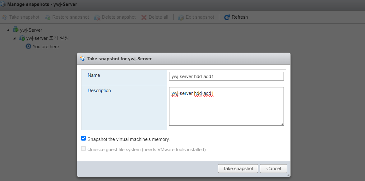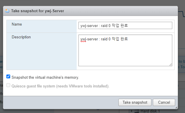 (19) RAID 0 작업이 완료된 서버에 대해 이전과 동일하게 스냅샷을 미리 생성해둔다.