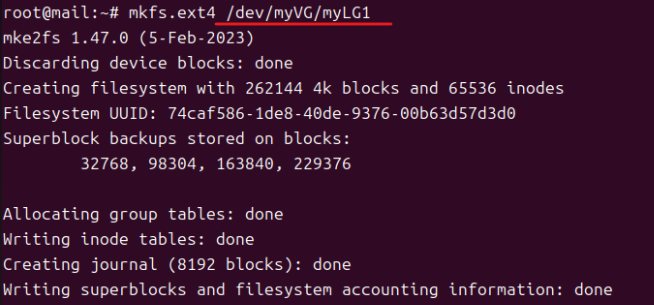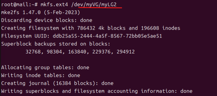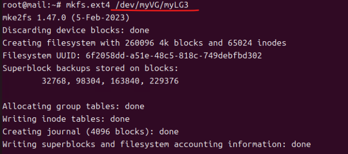 (12) mkfs.ext4 /dev/myVG/myLG1, mkfs.ext4 /dev/myVG/myLG2, mkfs.ext4 /dev/myVG/myLG3
