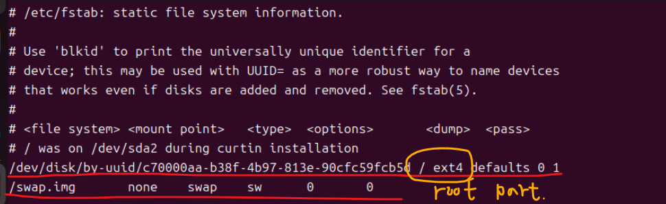 (5) 재부팅 이후에도 마운팅 환경을 영구적으로 유지하기 위해 nano 또는 geditor를 통해 /etc/fstab 디렉터리를 열어서 아래와 같은 구문을 추가한다.
